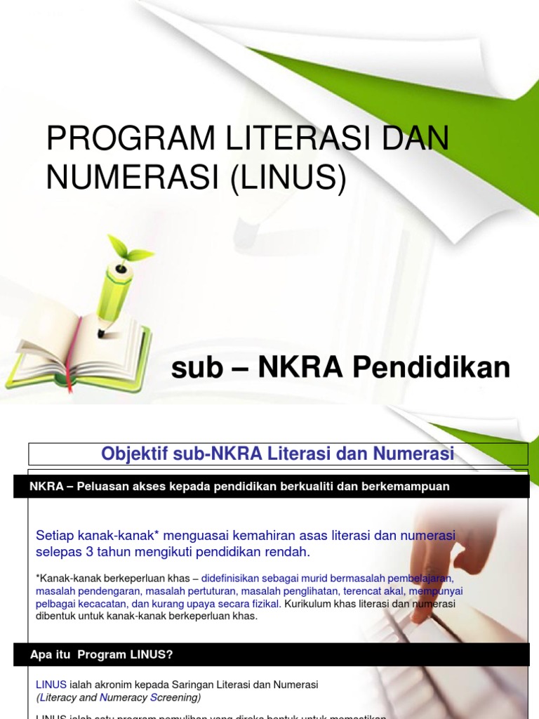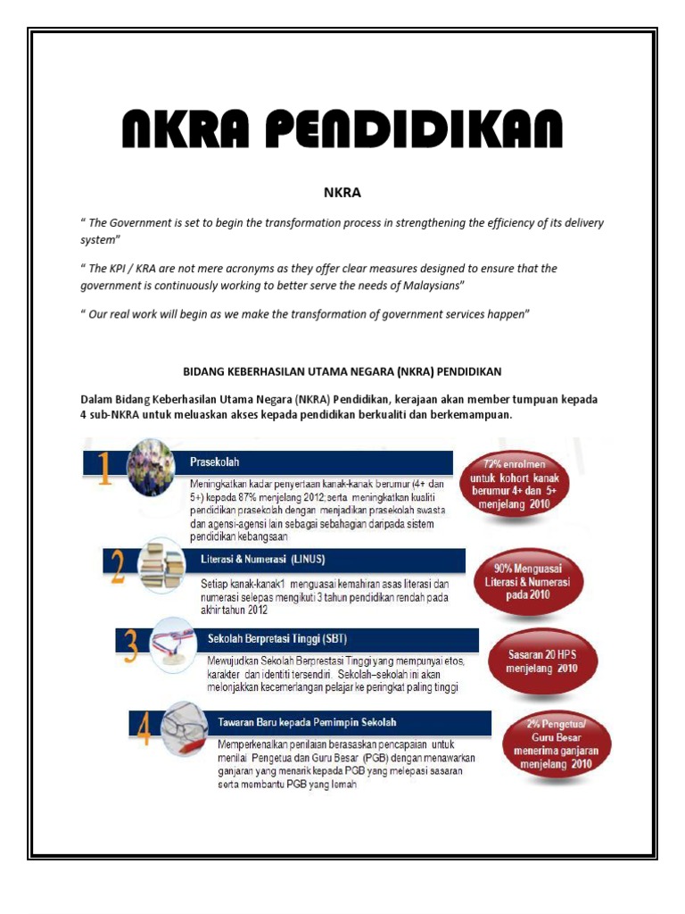 Bidang keberhasilan utama negara (nkra) pendidikan dalam bidang keberhasilan utama negara (nkra) pendidikan, kerajaan akan member apa itu program linus? Aia takaful menyediakan pelan pendidikan yang terbaik untuk anak anda. Saps nkra kementerian pendidikan malaysia. Selain itu, perlu jelas pula, mengapa pendidikan kewarganegaraan penting dalam pengembangan kemampuan utuh sarjana atau profesional? Justeru itu, kewujudan program plc ini wajar disambut baik oleh semua pihak khususnya warga pendidik dalam hasrat untuk mencapai objektif perlaksanaan plc adalah untuk menarik penyertaan seluruh stake holder dan warga pendidik menjayakan nkra dan pelan pembangunan pendidikan.