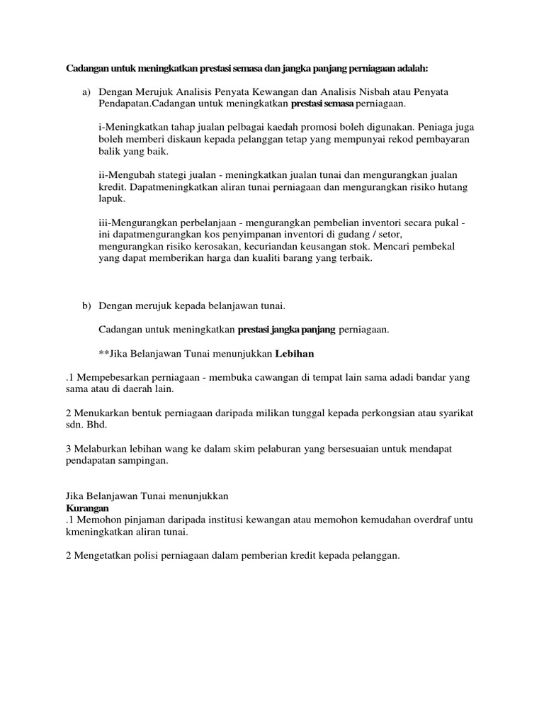 Related : Cadangan Meningkatkan Prestasi Jangka Pendek / Cadangan untuk meningkatkan prestasi semasa dan prestasi jangka panjang 1) mempercepatkan pembayaran hutang agar penambahbaikan restauran dapat dilaksanakan..